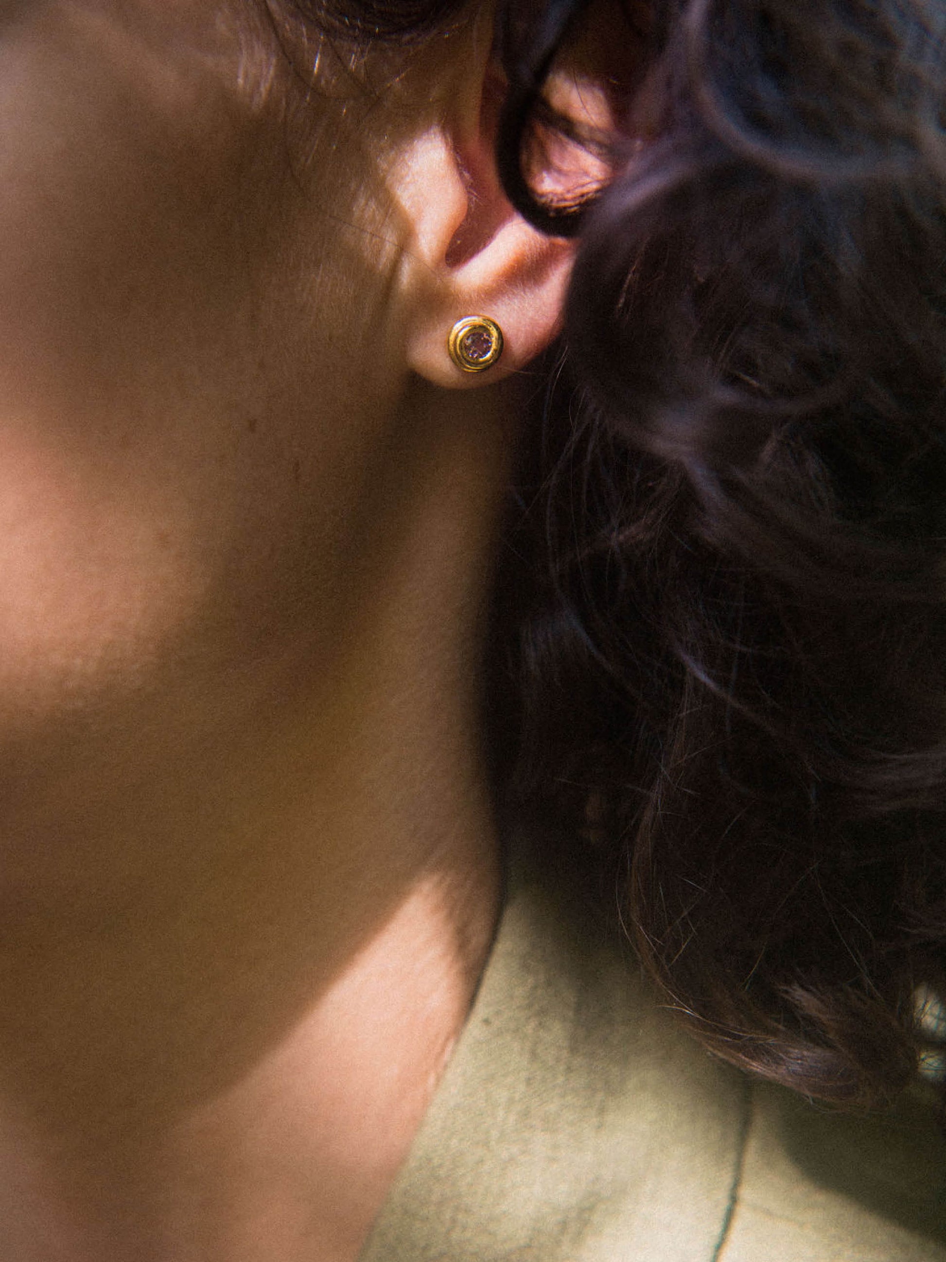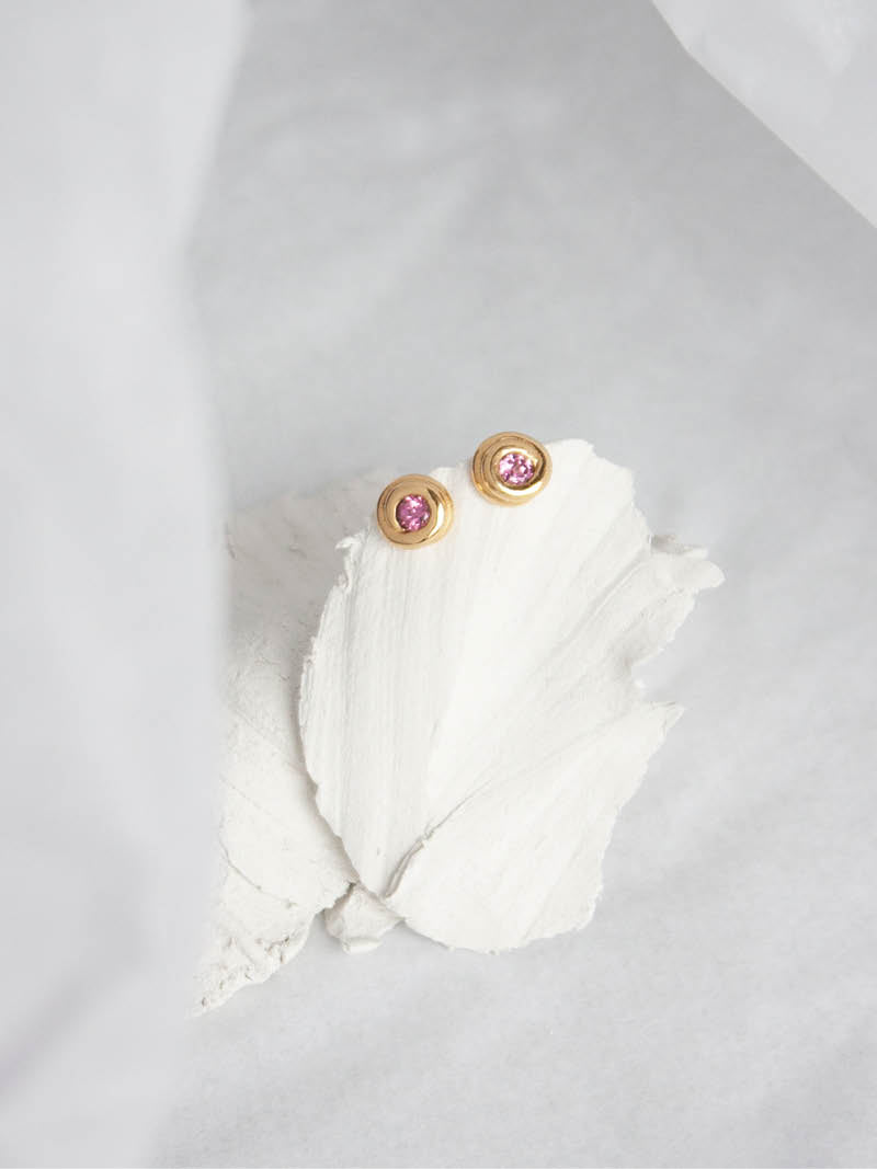 Les boucles d'oreilles Mimo roses sont composées d’un fil d’argent doré Vermeil, enroulé autour de deux pierres de rhodolites roses.
