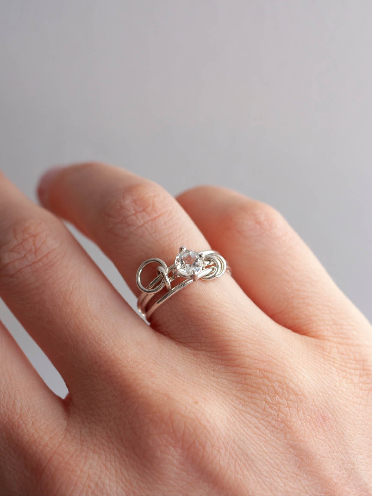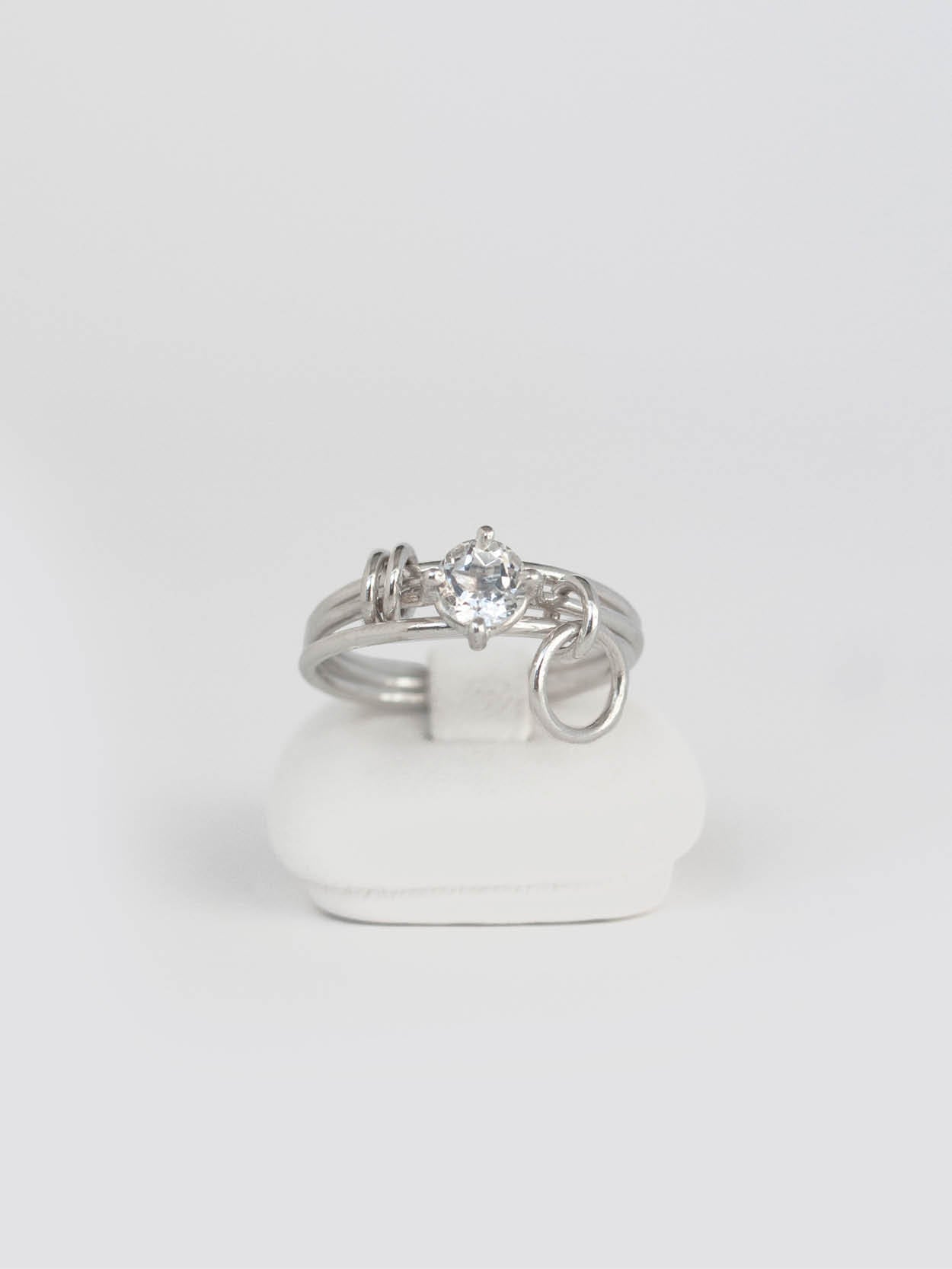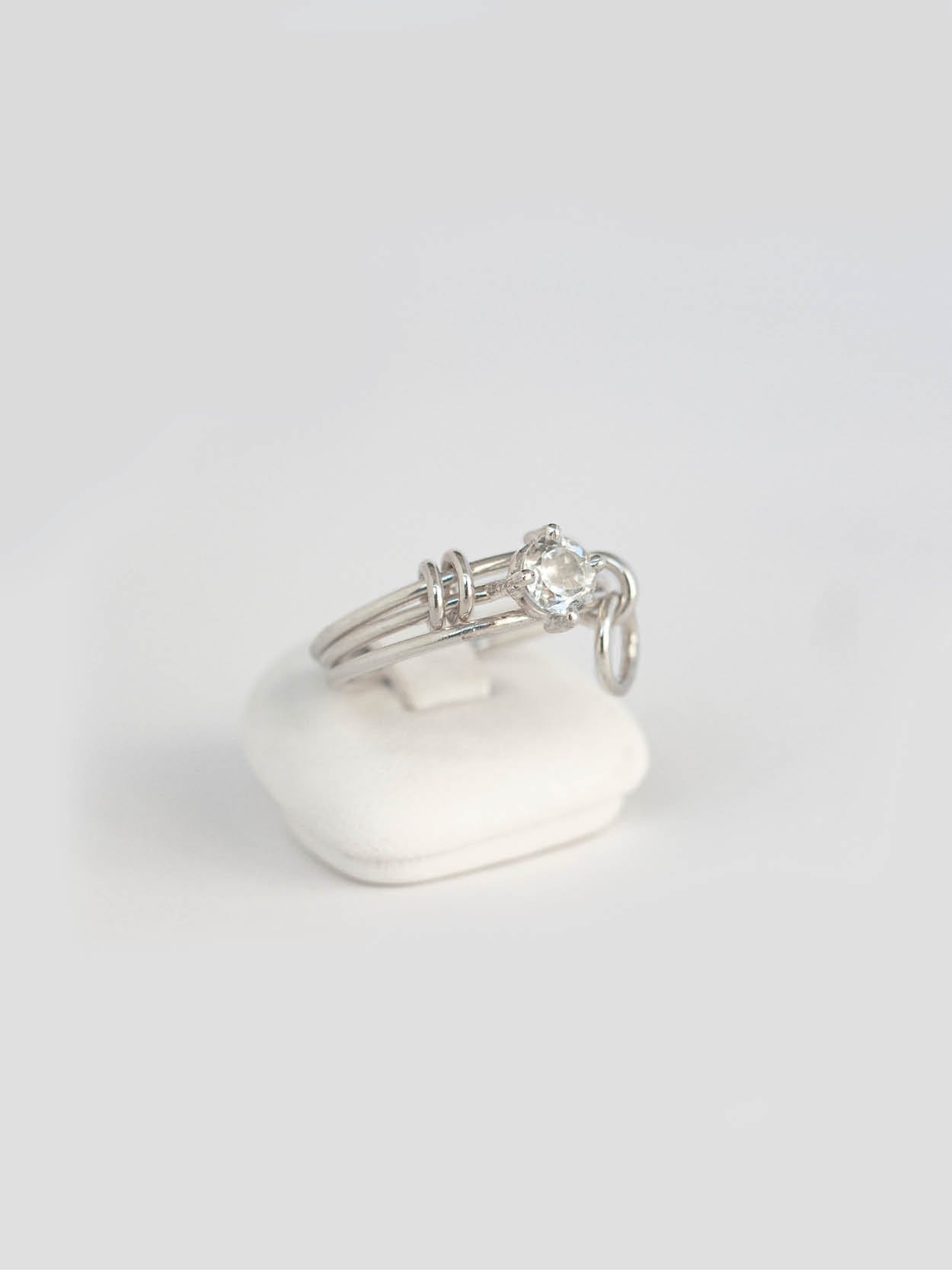 Une bague aux trois anneaux en argent, accompagné de petits anneaux amovibles, sertie d'une topaze blanche