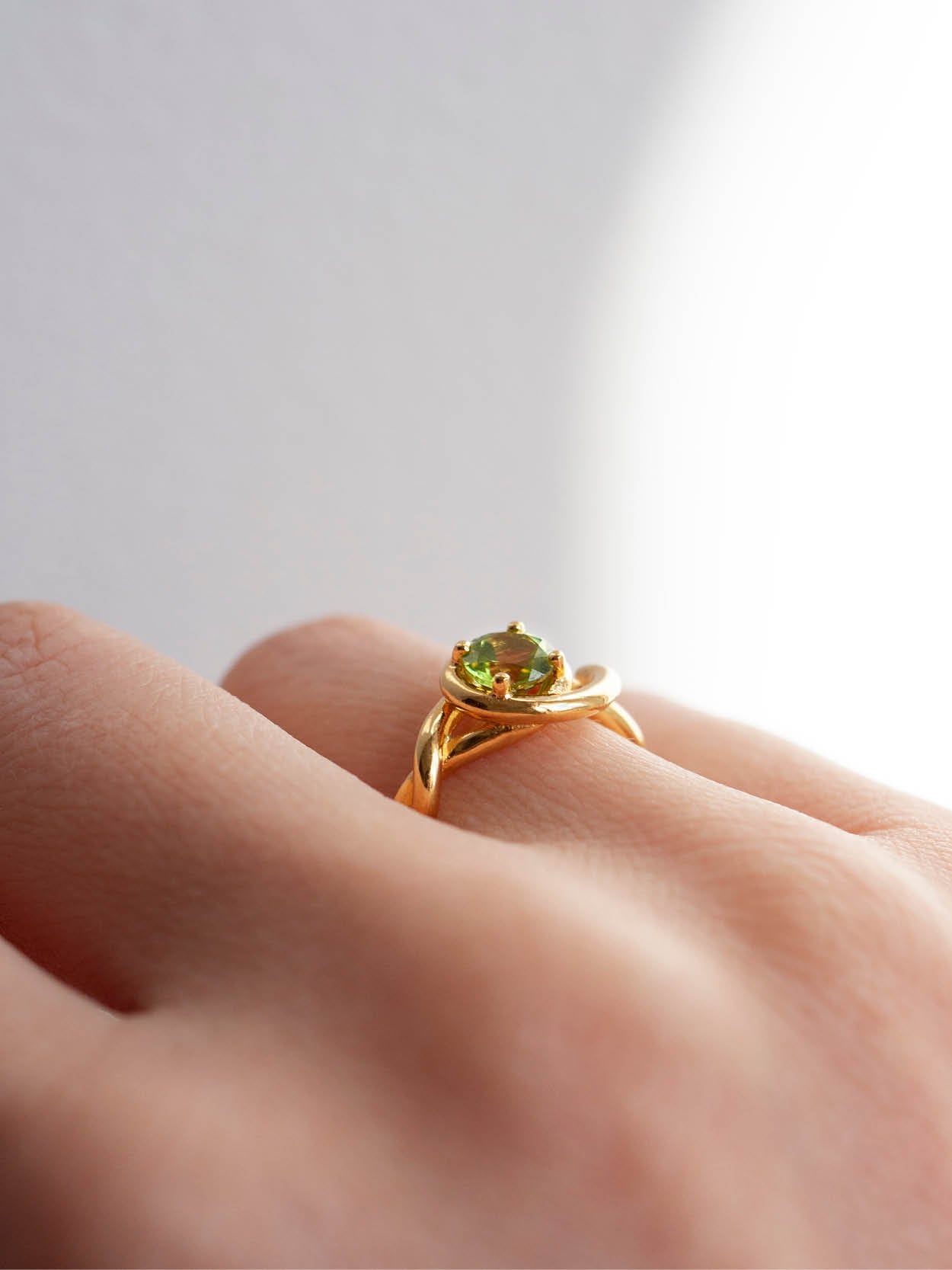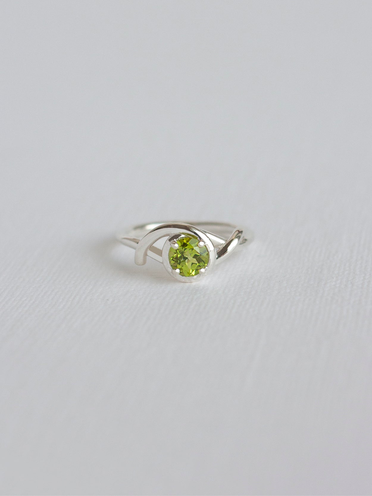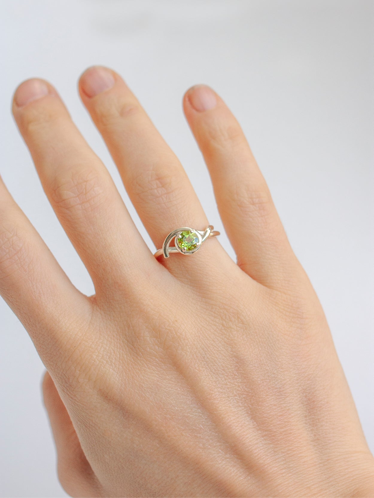 La bague Elia, un fil d'argent enroulé autour du doigt, entourant délicatement un péridot vert vif.