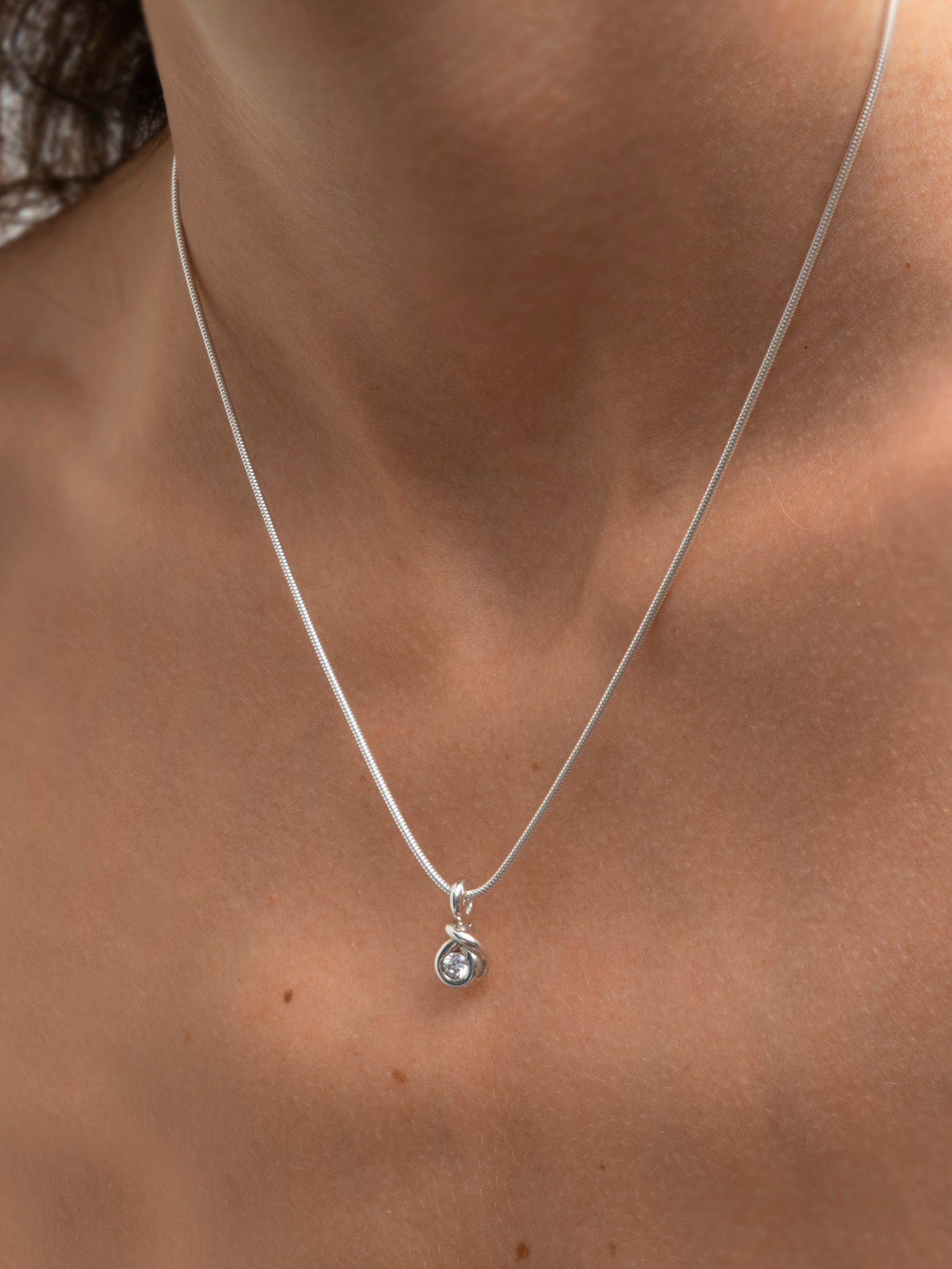 Le pendentif Isor blanc est un jeu d’entrelacements serti d'un zircon scintillant en son coeur.