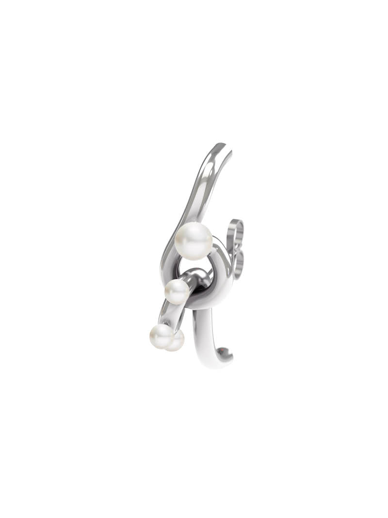 La boucle d'oreille Uni Perles, une constellation de perles blanches naturelles sur un fil d'argent torsadé, épouse gracieusement l'oreille.
